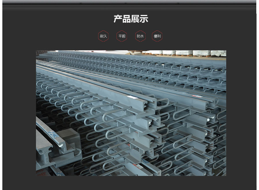 單組式伸縮量40-80mm,常用于高速橋,高架橋以及跨海跨河大橋中,具有經(jīng)濟(jì)耐用,防水抗拉伸的特點(diǎn),是市場(chǎng)中最常見的橋梁伸縮縫之一